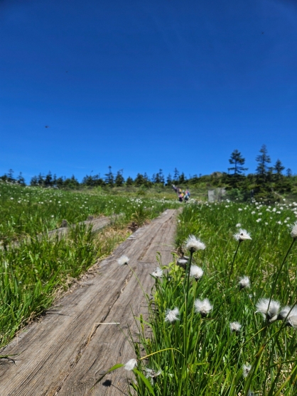 森林帯を抜けるとお花畑!わたすげふわふわ~♪