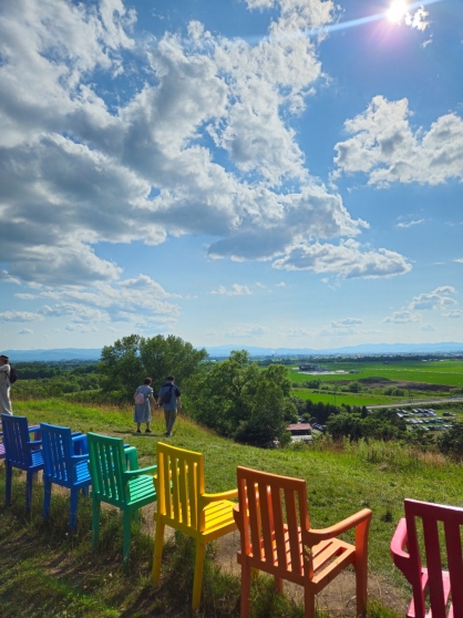 射的山から望む平野も最高でした。虹色のイスも映えスポットです♪