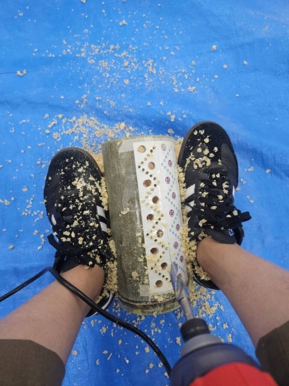 デザインをきめて、紙を竹にテープで貼り付けたらドリルで穴を開けていきます!これがストレス発散になってとっても楽しかったです。