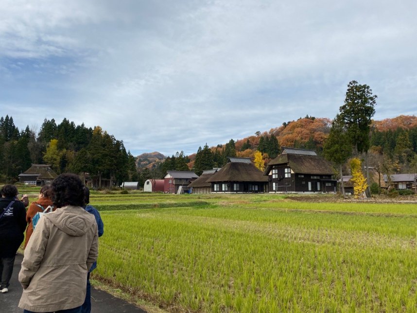 続いては柏崎市高柳町にある荻ノ島環状集落です。ここは、かやぶき屋根の民家が田んぼを中心に環状に点在する全国でも珍しい集落です。集落の成り立ちやこれまでの人々の生活など案内の方に詳しく教えてもらうことが出来ました!