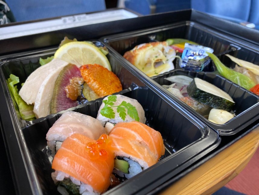 車内に入るとお弁当とワイングラス(割れないようにプラスチック)がセットされています。