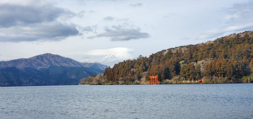 芦ノ湖と、箱根神社の平和鳥居と、富士山!