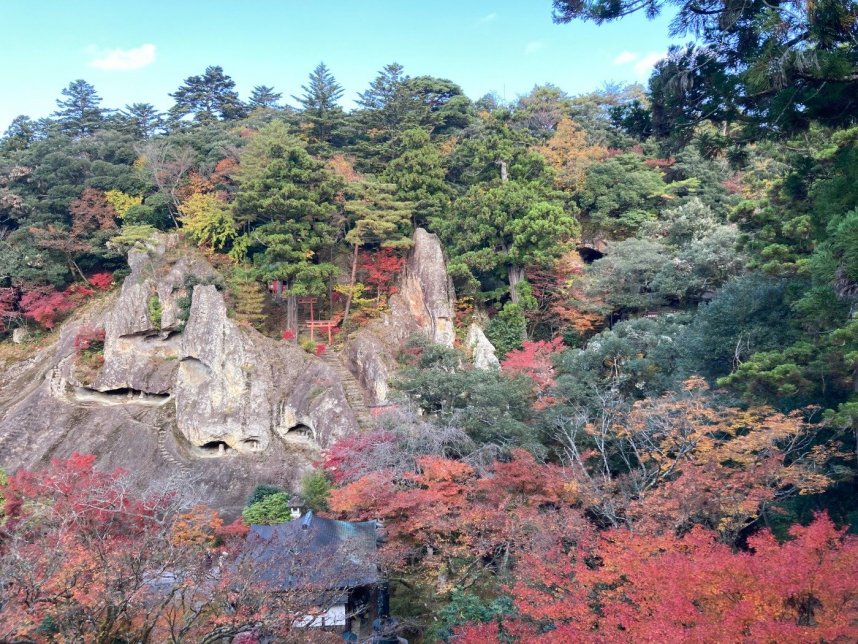 紅葉・・・石川県 那谷寺(赤色のもみじと白色の奇岩のコントラストが美しいです!)