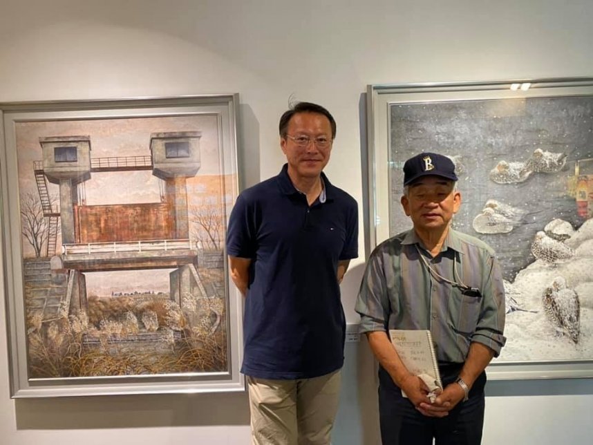 私の隣の方が山崎順平氏で、私の後ろの絵は県展賞を受賞した時のものです。