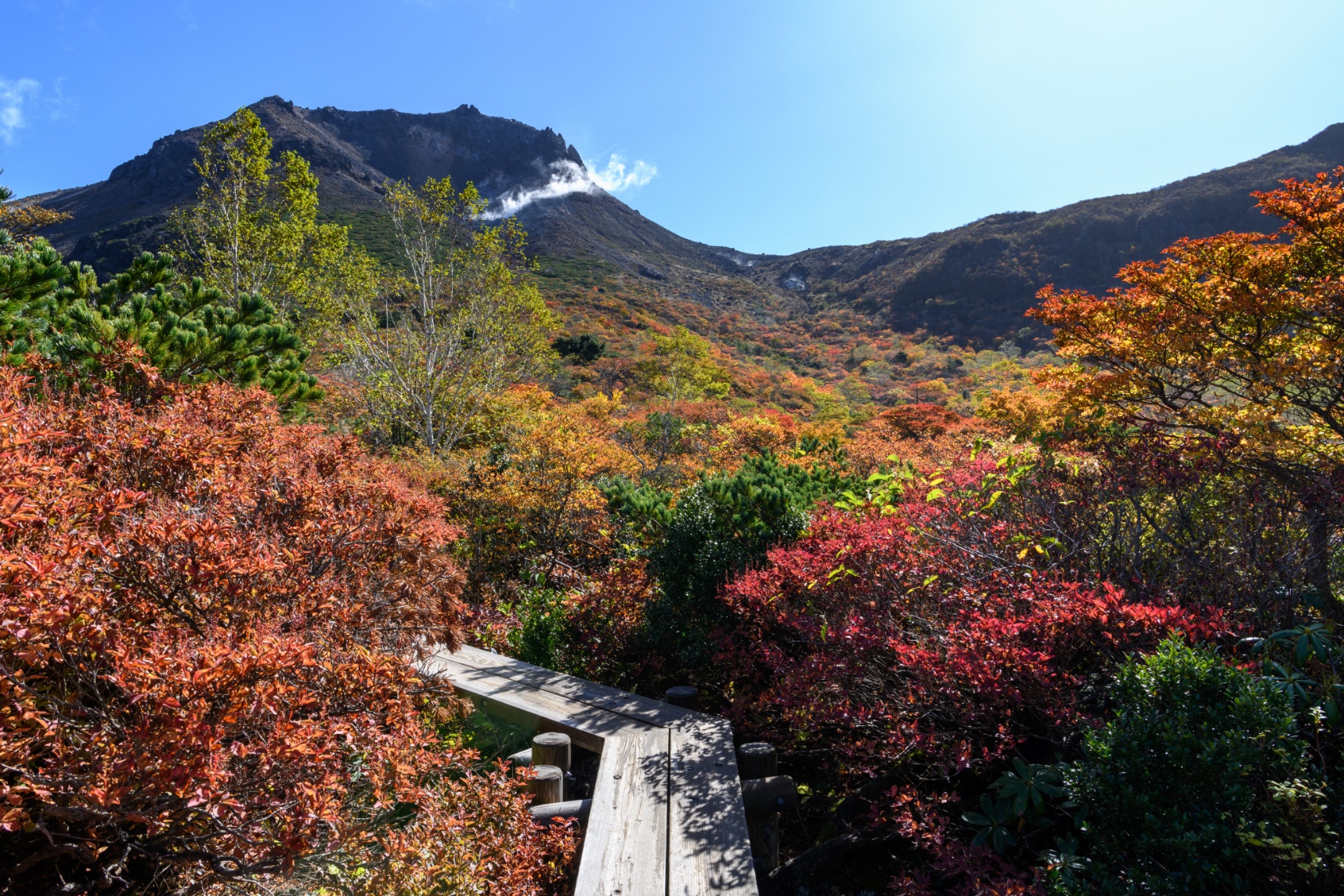 東日本指折りの山岳紅葉を通常コース(沼原からロープウェー山頂駅)の逆ルート、ほぼ下りの行程で歩きます。ナナカマドやモミジで赤く染まる茶臼岳の姿は一度は観るべき景観です。最終地点の沼原池までのルートからはいつ振り返っても見事な景観が続きます。