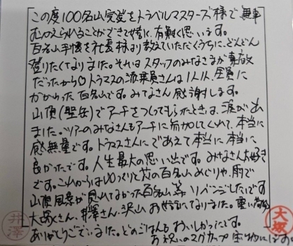 この度100名山完登をトラベルマスターズ様で無事むかえられることができて嬉しく、ありがたくおもいます。